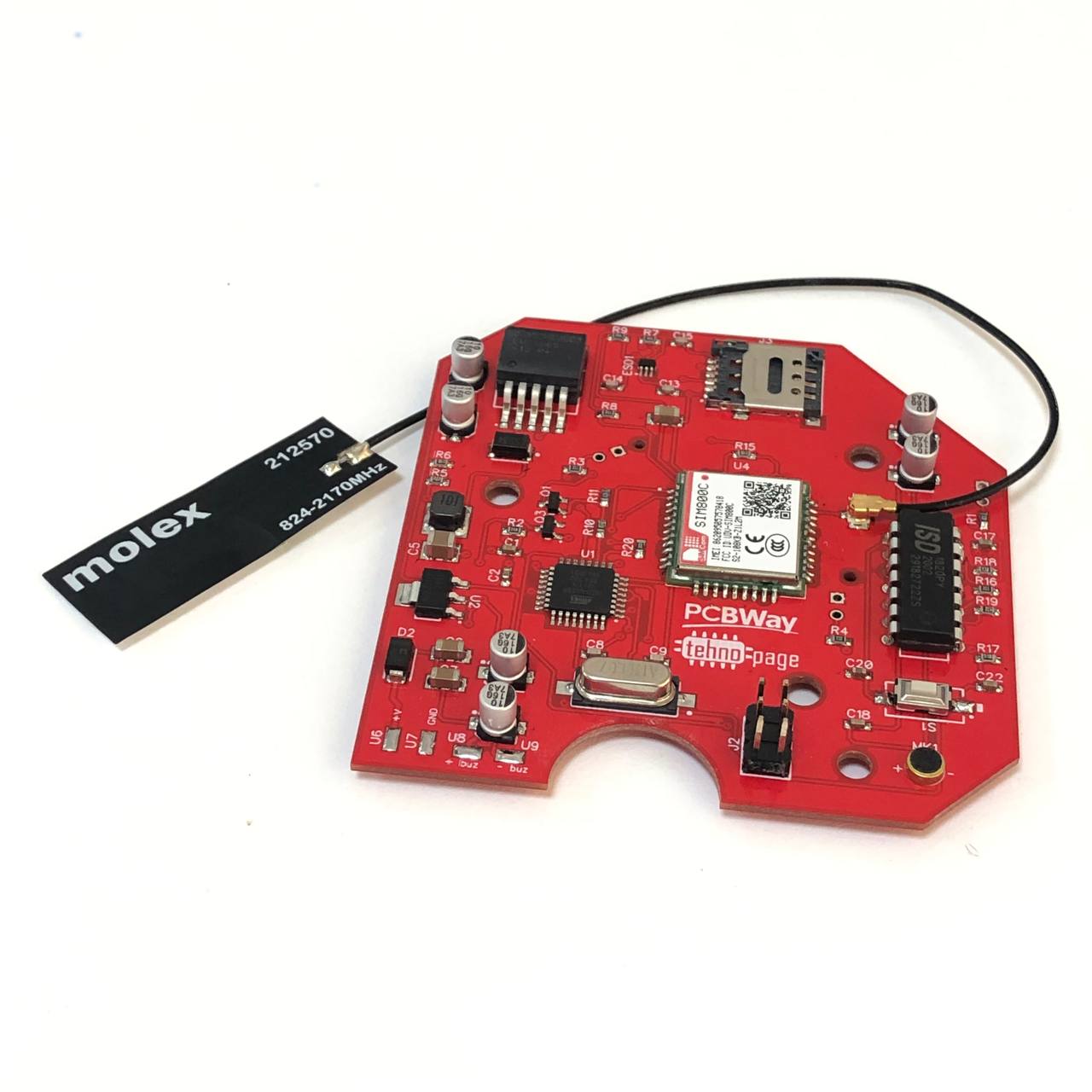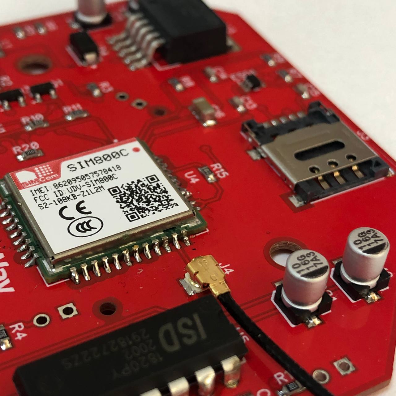 IoT устройство "GSM пожарный извещатель" на основе GSM модуля SIMCOM SIM800C. Передавал записанное заранее голосовое сообщение на заданный номер телефона. В устройстве имеется фотодиод и ИК светодиод которые в паре следили за прозрачностью среды. При возникновении задымления, управляющая программа далее запускала звонок на номер телефона записанный ранее через SMS команду. Программа ждала ответ на звонок, и после ответа начала проигрывать заранее записанное сообщение. Сообщение проигрывалось по кругу до тех пор, пока не положит трубку вызываемый абонент. На плате имелась управляющая клавиша для тестирования работы извещателя, разъем для программирования.